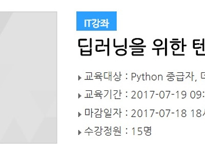 안녕하세요. 이수아비입니다. 부산 글로벌 IT 교육센터에서 진행하는 무료 IT 강좌 정보를 소개해 드립니다. 주제는 "딥러닝을 위한 텐서플로우 프로그래밍" 입니다.뭔가 심오하고 전문적으로 보이는 주제인거 같습니다. ㅎㅎ 요즘 이슈가 되고 있는 기계학습과 딥러닝에 관한 교육으로 IT 개발자가 참여하면 많은 스킬을 습득할 수 있을 것 같고 관련 사업을 운영하시는 관계자 분도 교육 들으시면 사업 운영하는데 많은 도움이 되지 않을까 싶습니다.단, 프로그래밍 교육이라 관련 지식이 있으신 분이 들으셔서 얻어가는 것도 많으실거고 관련 지식이 없는 분들은 수업 이해가 조금 힘들지 않을까 하는 생각도 드네요.그만큼 깊이 있는 강의가 아닐까 생각됩니다! 신청은 아래 홈페이지 들어가셔서 자세한 내용 확인 후 신청하시면 됩니..